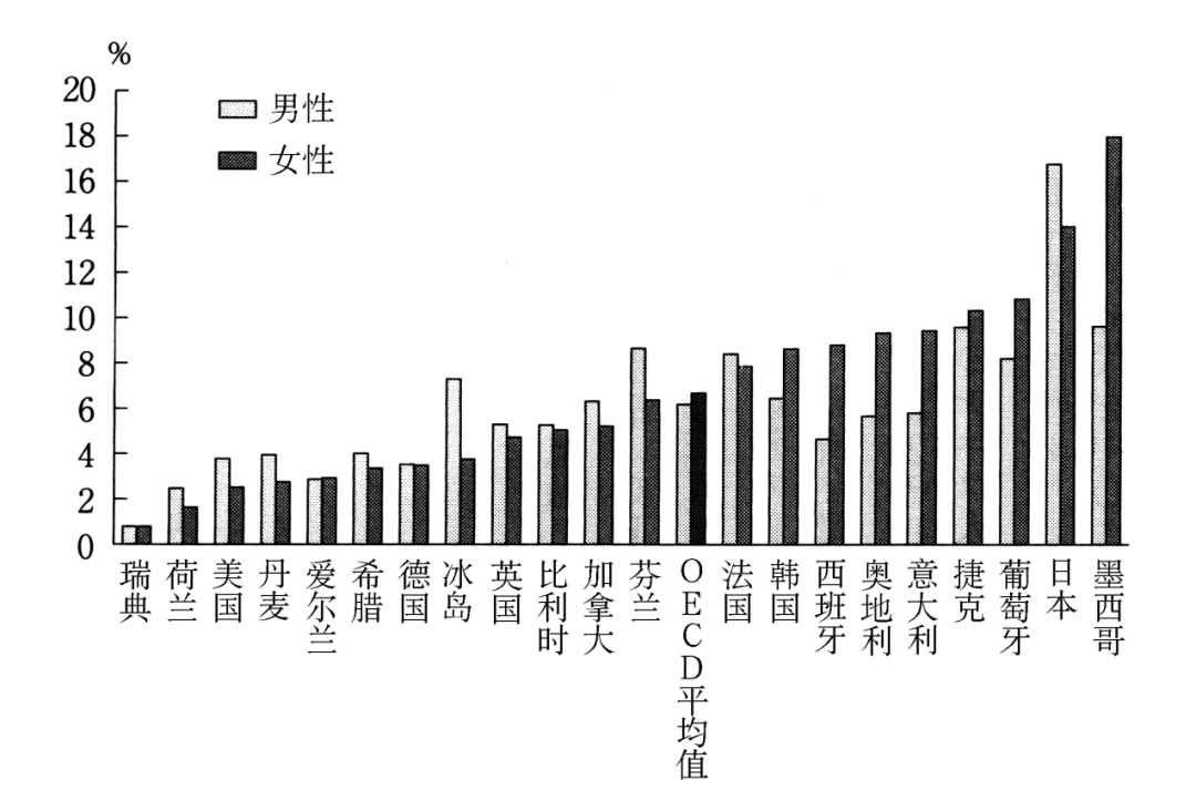 另一方面,经济合作与发展组织 (OECD) 在2005年曾发布调查报告“Women and Men in OECD Countries”(经合组织国家中的男性与女性),其中有一项关于“社会孤独”(Social Isolation)的问题,主要调查问卷对象在工作之外的日常生活中,与友人及同僚一起参加体育俱乐部、教会、文化沙龙等活动的情况。调查结果如图所示。