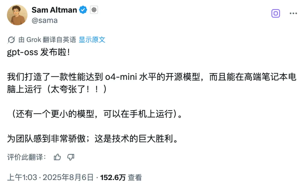 OpenAI CEO Sam Altman(山姆·奥特曼)在社交媒体上的兴奋溢于言表:“gpt-oss发布了!我们做了一个开放模型,性能达到o4-mini水平,并且能在高端笔记本上运行。为团队感到超级自豪,这是技术上的重大胜利。”