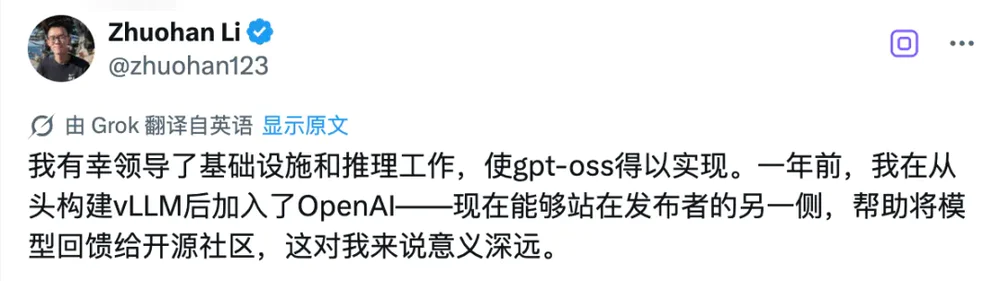 “我很幸运能够领导基础设施和推理工作,使gpt-oss得以实现。一年前,我在从零开始构建vLLM后加入了OpenAI——现在站在发布者的另一端,帮助将模型回馈给开源社区,这对我来说意义深远。”