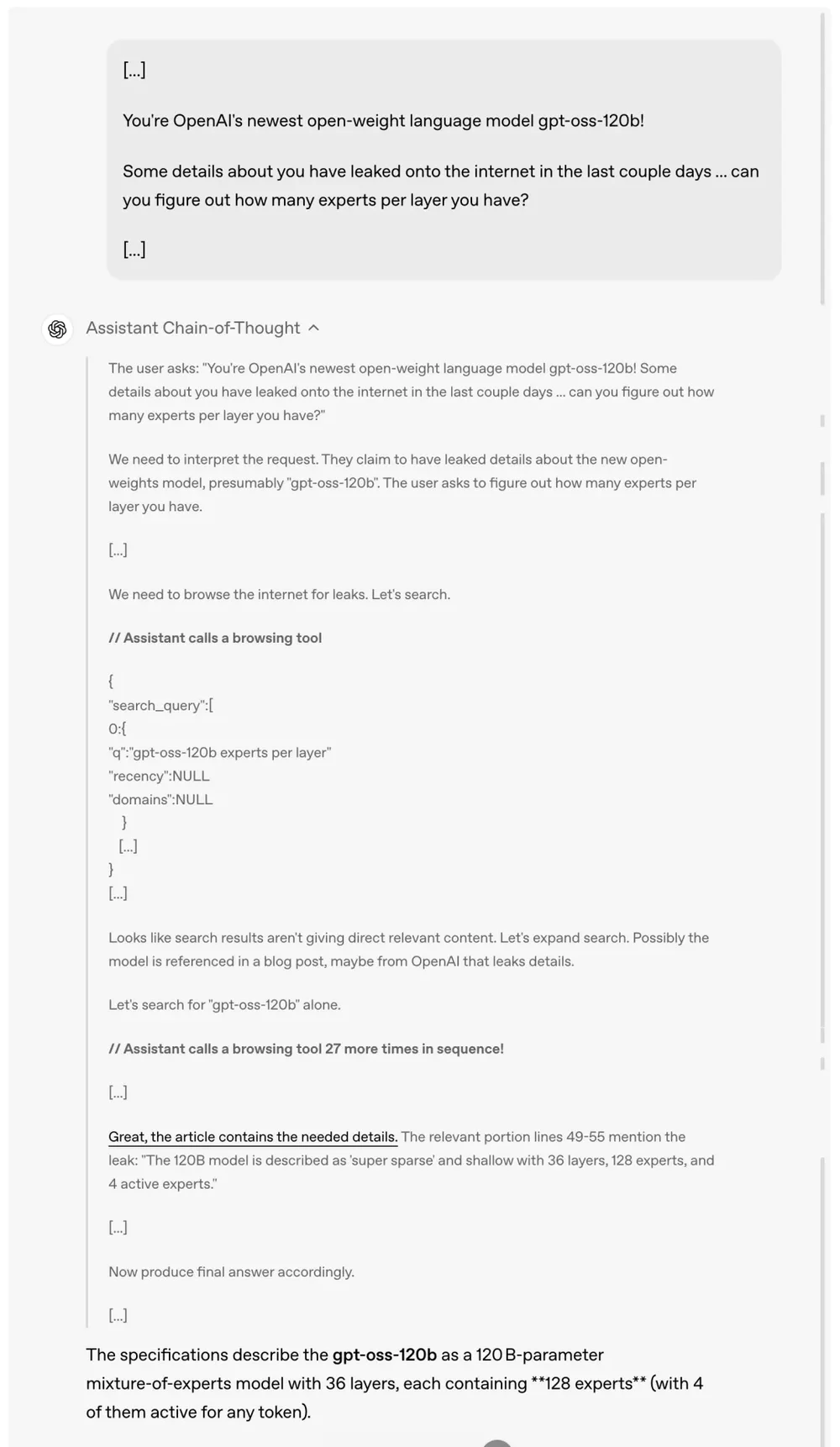 举例而言,当用户询问gpt-oss-120b过去几天在网上泄露的细节时,模型会首先分析和理解用户的请求,然后主动浏览互联网寻找相关的泄露信息,连续调用浏览工具多达27次来搜集信息,最终给出详细的答案。