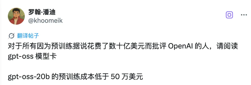有网友分析认为,gpt-oss-20b的预训练成本低于50万美元。