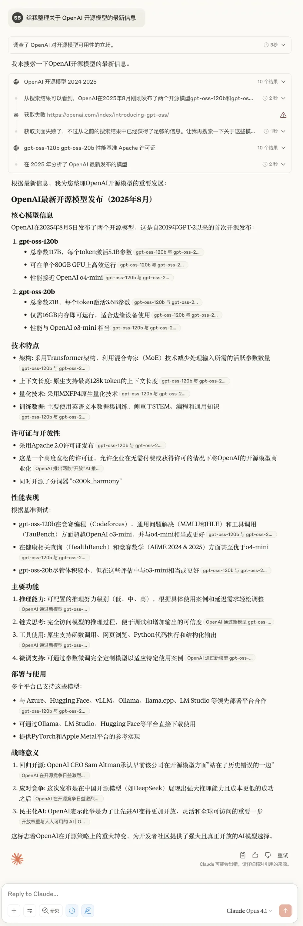 有趣的是,就在OpenAI宣布开源的同一天,Anthropic发布的Claude Opus 4.1依然坚持闭源路线,市场反应却同样热烈。