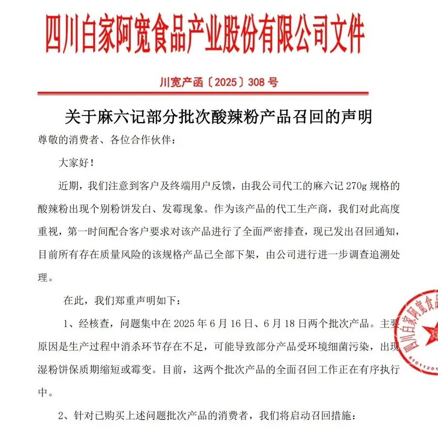 7月27日,本次发霉粉饼的生产商,麻六记酸辣粉代工厂白家阿宽发布声明称,问题出现在两个批次的产品“生产过程中消杀环节存在不足,可能导致部分产品受环境细菌污染,出现湿粉饼保质期缩短或霉变”。