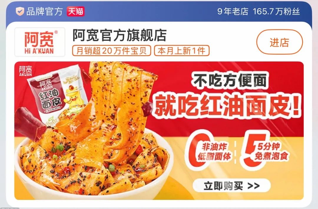 天猫阿宽官方旗舰店显示店铺月销量超20万件,他家招牌产品”红油面皮“的商品详情页称全网累计销量高达2亿件。