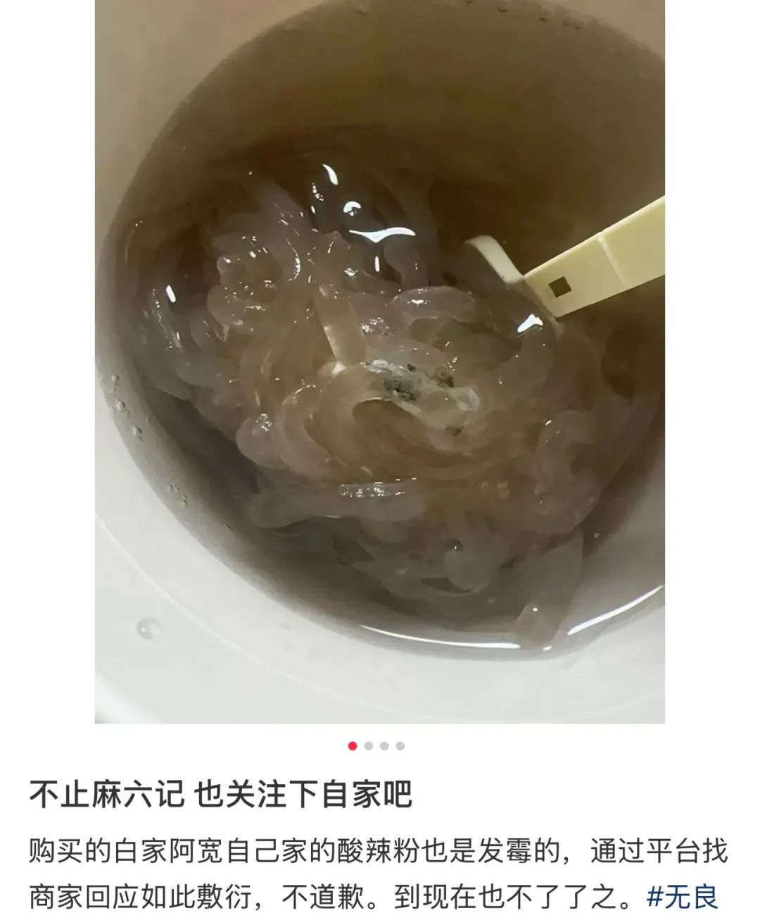 有网友在社交媒体上发帖,称自己在拼多多“阿宽速食食品官方旗舰店”购买的“湿粉酸辣粉”粉饼上出现霉斑。而且这样的帖子不止一例,许多网友都反映自己买到过变质的阿宽酸辣粉。