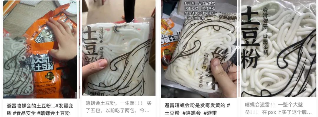 今年4月份,网上集中出现过一批买到嘻螺会发霉砂锅土豆粉的“避雷帖”,也都是保质期内出现湿粉饼变质情况: