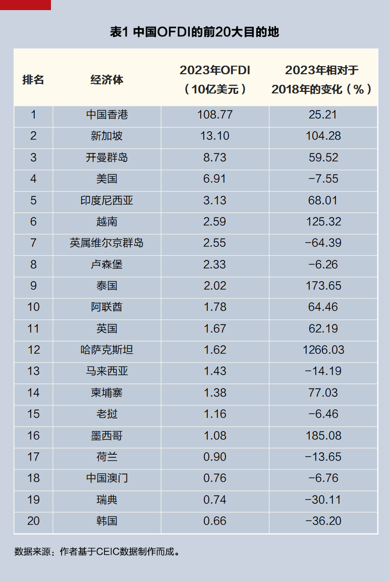 从投资目的地分布看,表1列出了2023年中国OFDI的前20大目的地。中国香港位列第一,其次是新加坡,美国排在第四位。考虑到2018年特朗普第一任期就开始对中国开征大规模关税并加强投资审查,我们特地将2023年与2018年的情况进行了比较,以粗略观察关税对OFDI的影响。结果显示,中国对美国的OFDI下降了7.55%,而对美国邻国墨西哥的OFDI陡增185.08%。这似乎表明,中国企业采取了一种“迂回”战略:通过在墨西哥投资设厂,再将产品出口到美国,从而规避关税壁垒。