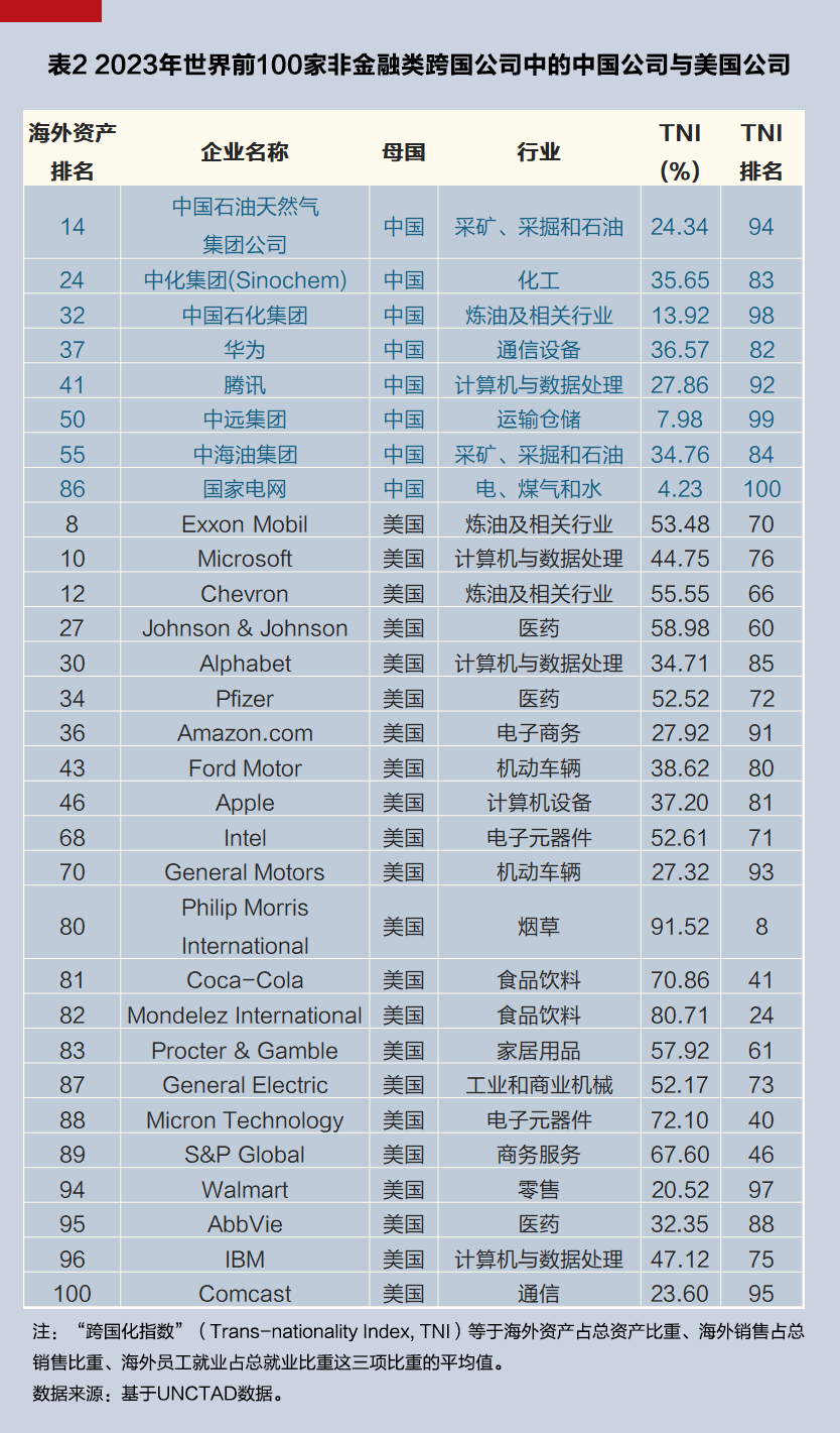 其次看微观层面,在2023年按海外资产(foreign assets)排名的世界前100家非金融类跨国公司(non-financial TNCs)中,来自中国内地的有8家,包括中国石油天然气集团公司、中化集团、中国石化集团、华为、腾讯、中远集团、中海油集团、国家电网,位列美国(22家)、法国(13家)、德国(11家)、英国(11家)、日本(9家)之后。