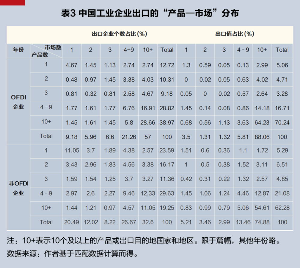 其次,从中国工业企业的“出口产品—出口市场”分布来看(见表3)。2013年,与不实施OFDI的同类出口企业相比,实施OFDI企业中的“1产品—1市场”的出口企业占出口企业总数的较小比重,但其出口值则与不实施OFDI的同类出口企业相当;而实施OFDI的“10+产品—10+市场”的出口企业占出口企业总数的较大比重(29%),其出口值比重更高(64%)。因此,以产品与目标市场衡量,实施OFDI的企业相对于未实施OFDI企业更加多元化、其出口集中度也越低。