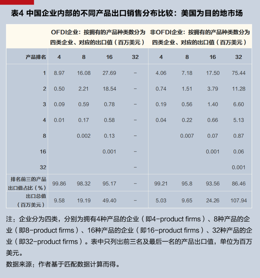 第三,从OFDI企业与非OFDI企业的出口销售分布来看。我们重点分析三种情景。第一种情景:企业的不同产品出口到特定市场情形。以2013年中国工业企业向美国出口为例[5],OFDI企业与非OFDI企业均按照出口产品种类(按HS 8分位编码分别为4、8、16、32种)分为四类。[6]我们发现,对于美国这个目的地市场而言,这两类企业的单个产品出口销售值相对于产品排序位置的弹性分别约为-2.834、-2.693,即意味着出口销售值随着排序位置(从高到低)而下降(见图3、表4)。但相对于拥有不同产品范围的非OFDI企业,OFDI企业的最热销产品的平均出口值较大,这可能是因为OFDI促进了企业的出口。