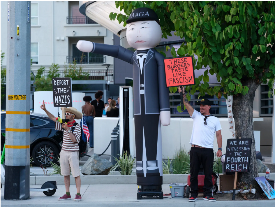 周末,抗议埃隆·马斯克的人们走上餐厅外的人行道。