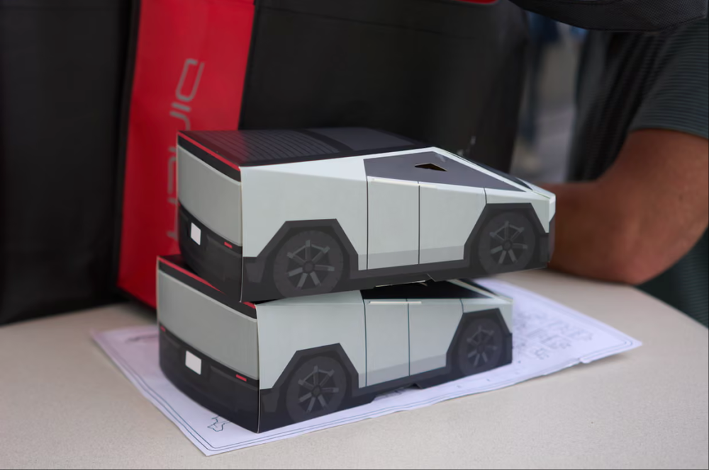 食物本身看起来也像特斯拉的周边商品。华夫饼上印着特斯拉APP的闪电图标,撒着糖粉,就像迪士尼乐园里的米奇华夫饼一样。汉堡和三明治装在带通风口的赛博卡车形状的盒子里。