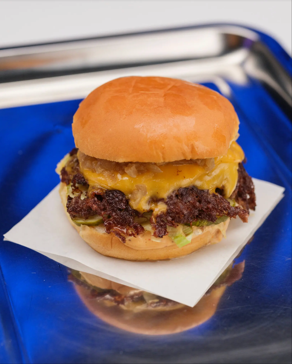 菜单方面,主打是Smash Burger。Tesla工程师特别定制了一套压肉工具,以追求那种边缘焦脆、中心多汁的口感,配上焦糖洋葱和奶酪。这种汉堡是餐桌上的高频菜品,但“工程感”并没有让它特别出圈。