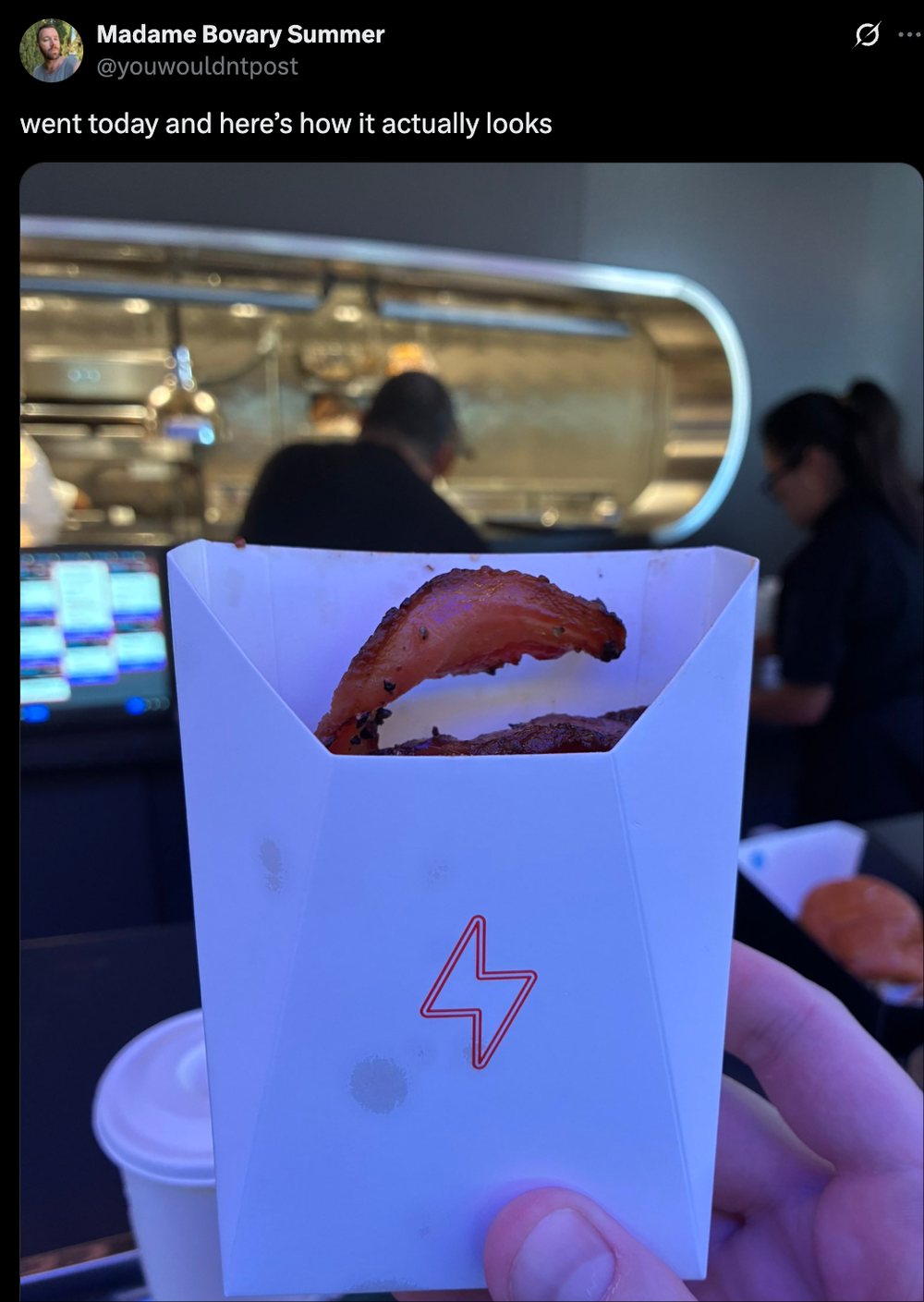 这个星光熠熠、马斯克本人到场剪彩、带着科技狂人精神的餐厅,也很快就被顾客批评说上菜慢、食物平平。大量观光客与粉丝让就餐体验变得嘈杂又混乱。连大老远专程赶去体验的人,原本期待它是一个“未来餐厅”,到了却发现并没有什么未来感,最多算个“中等”。