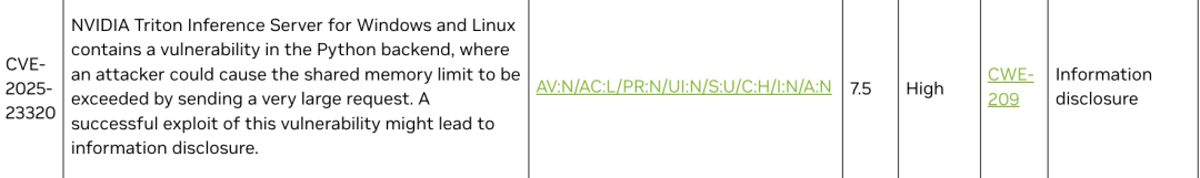 CVE-2025-23320:当攻击者发送一个超大请求超出共享内存限制时,会触发异常,返回的错误信息会暴露后端内部IPC(进程间通信)共享内存区的唯一标识符(key)。