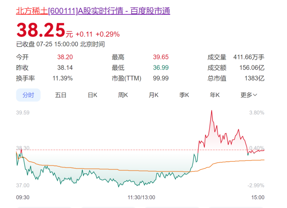7月10日晚间,北方稀土发布2025 年半年度业绩预增公告。公司预计,2025年上半年净利润将达到9亿至9.6亿元,同比增长高达1882%~2014%。受此影响,截止至7月25日,这家稀土巨头半个月内市值飙升50%以上,成交额突破1383亿元。
