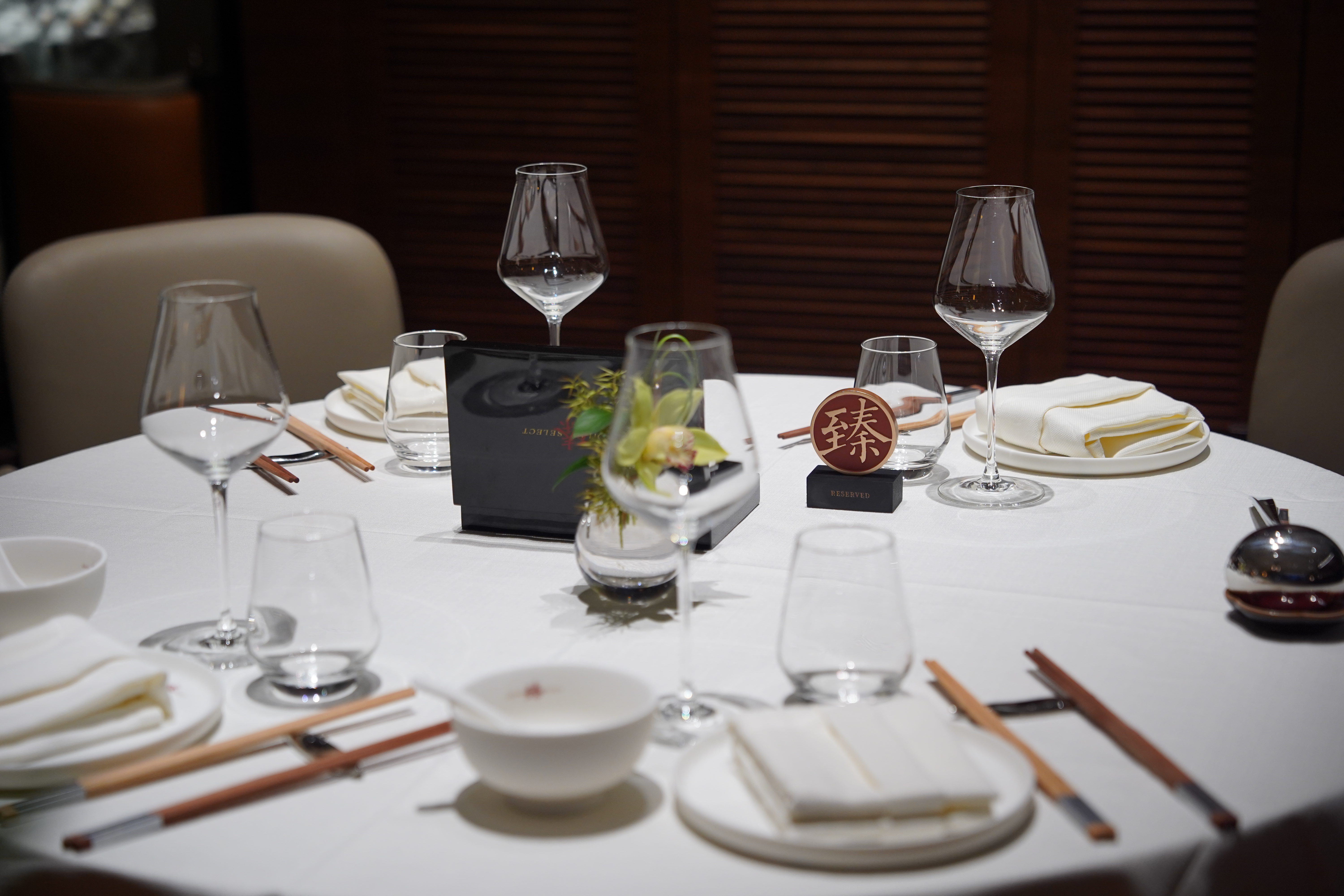 当日虎嗅到达该店时,前厅经理正带着服务人员为中午的开台做准备。侍者告诉虎嗅:餐碗中的勺把要统一朝向九点钟方向。勺子、餐盘上的甄字及筷架需要确保在同一条线上、餐盘上的甄字要位于餐桌上的波尔多酒杯和勃艮第酒杯的正中间,餐椅与台布、餐盘与桌边均需保持一指的距离,桌花要正对上餐位。