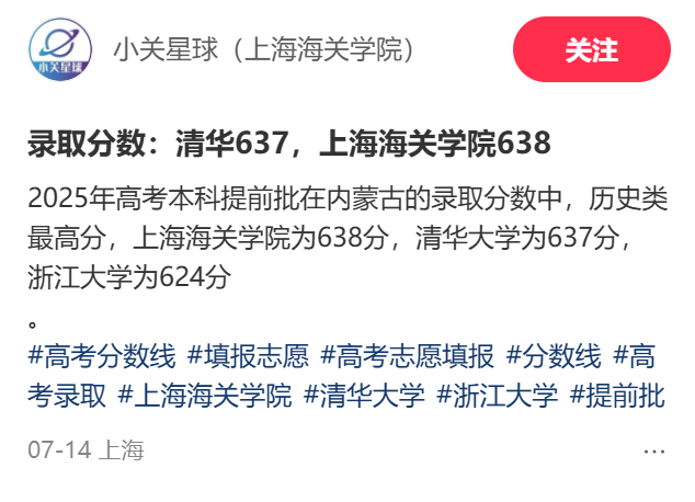 内蒙古高考提前批录取分数中,上海海关学院的历史类考生分数线达到了638,而清华大学只有637分。