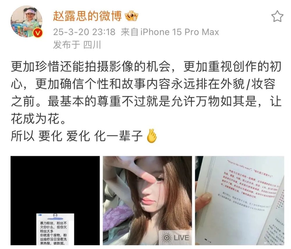 赵露思,其实一直是个典型的“网感型艺人”。她起家在抖音,积累千万级粉丝,成为抖音早期稀缺型艺人,获得自带观众的先发优势;回到微博,她硬刚黑粉时还输出过“允许万物如其是,让花成为花”“所以要化,爱化,化一辈子”等迷惑金句;甚至连那位被家暴16次、连赔偿款都拿不到的素人小谢,也被她卷入词条风暴——结果主角是赵露思仙女下凡。