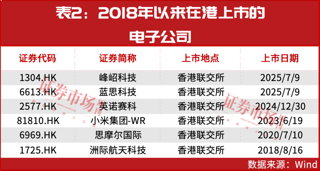 据统计,自2018年至今,港股市场申万电子行业共有6家公司上市。其中,2019年、2021年、2022年没有新公司上市,剩余年度则保持一年一家的水平(见表2)。今年以来,已经有两家电子龙头公司上市,而后续还有14家电子公司在排队,这意味着今年的港股市场将迎来一个科技公司上市大年。