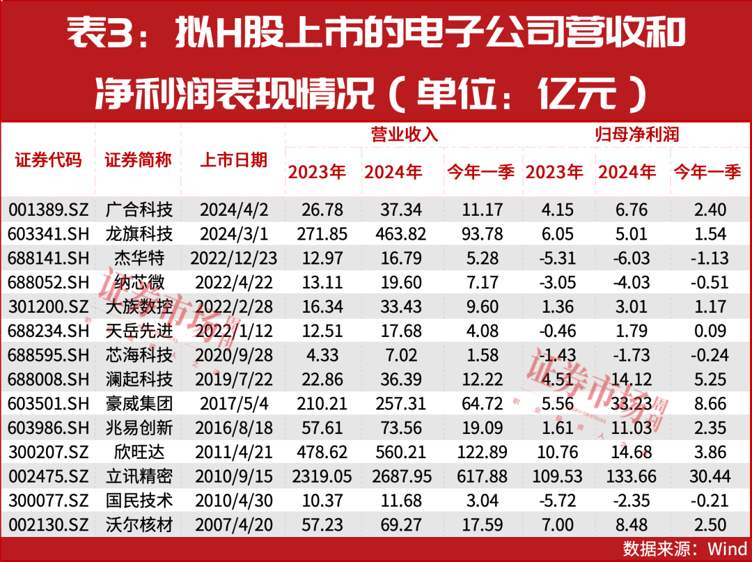 就14家拟H股上市的电子公司营收和业绩情况看,年度营收规模在千亿元以上的仅立讯精密一家,百亿元级别的有欣旺达、豪威集团和龙旗科技三家,余下公司营收均在百亿元以下。年度归母净利润在100亿元以上的有立讯精密;10亿元以上的有豪威集团、欣旺达、澜起科技、兆易创新;2亿元-10亿元的有沃尔核材、广合科技、龙旗科技和大族数控,余下公司均在2亿元以下或亏损(见表3)。
