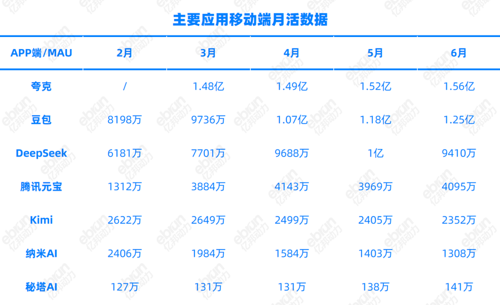在激进投流下,夸克和豆包都维持了始终的上涨趋势。夸克APP端的月活从2月的1.48亿增至6月的1.56亿;豆包月活在4月首次破亿,此后也维持每个月双位数增长。