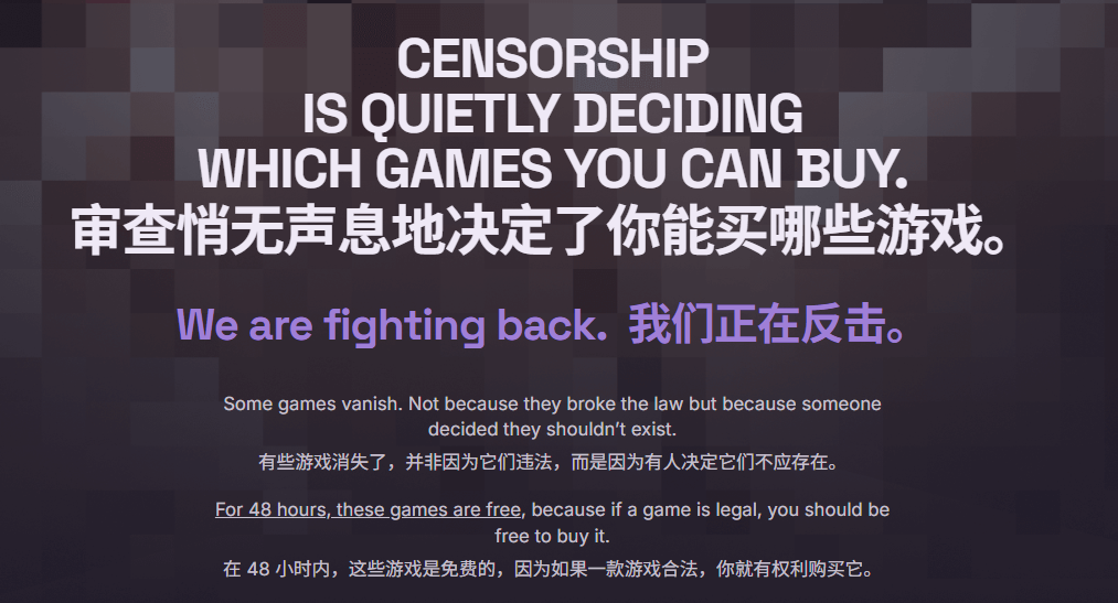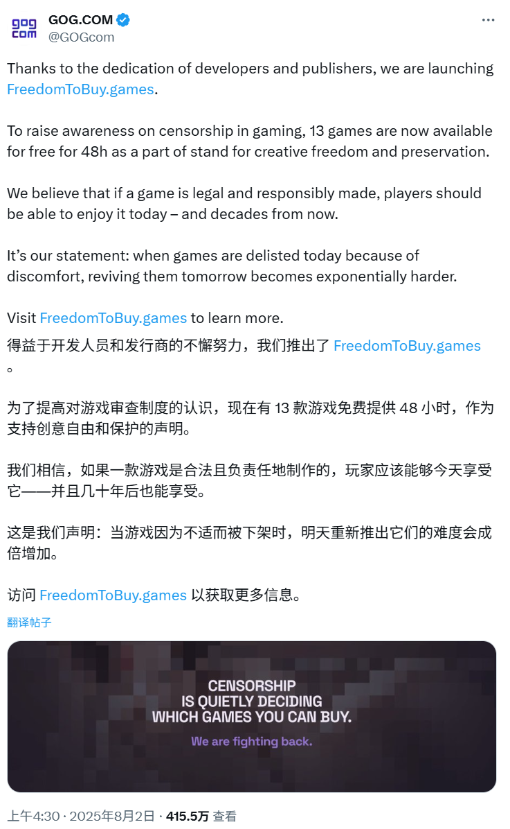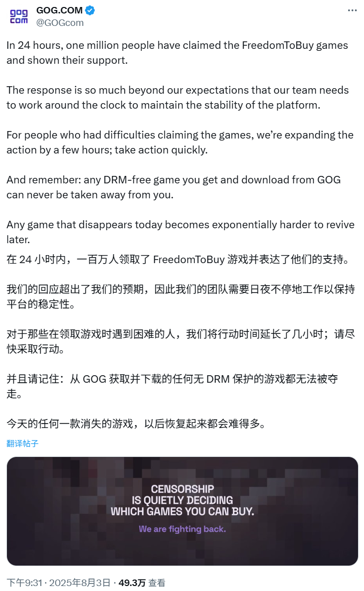 8月2日,GOG官方账号发推宣称自己会永远和玩家站在一起,并开启了名为“Freedom To Buy”的活动,限时48小时免费赠送13款游戏——且为了和审查规则作对,送的游戏清一色都是成人题材。