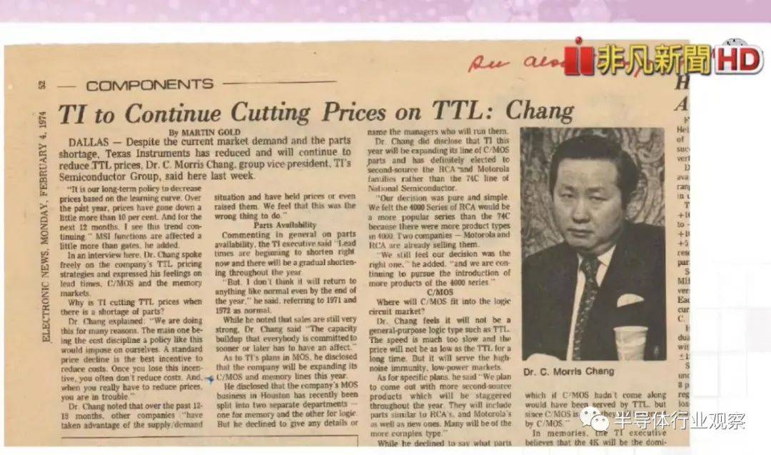 在张忠谋看来,上述的所有技能中,“策略”是更高一层的技能。他举例说到,如下图所示,他在TI的时候,就做了一个非常成功的策略。张忠谋表示,在TTL方面,他通过cost down的策略,能让竞争对手(Intel)绝望。