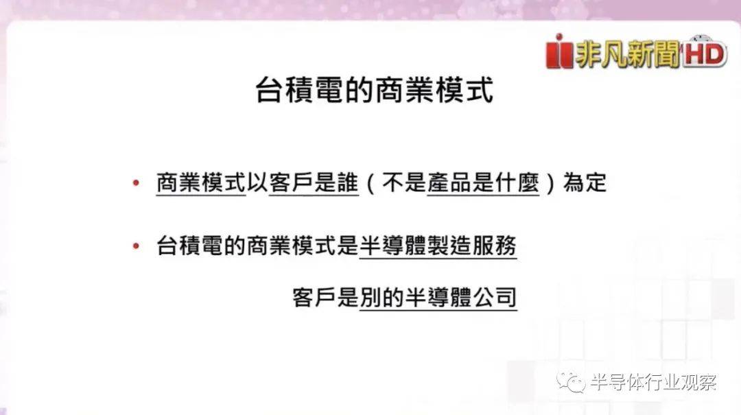 关于台积电的商业模式,张忠谋说道,台积电的前120号员工其实不是很了解,他们很单纯地认为台积电也只是做IC,跟其他公司没什么不同。但张忠谋表示,商业模式是以“客户是谁”为定,而不是以“产品是什么”为定。