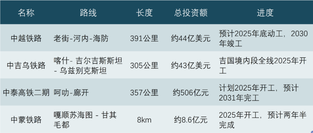 跨境铁路正在加速推进,中越铁路、中泰铁路、中吉乌铁路、中蒙铁路、中巴铁路都已开工,中尼铁路、中缅铁路仍在筹划中。