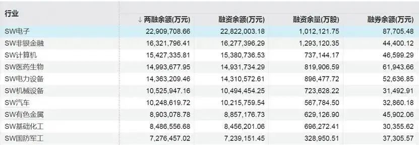 据万得的统计,两融靠前的行业,为电子、非银金融、计算机行业等,生物医药、军工等强势板块,融资也非常靠前。