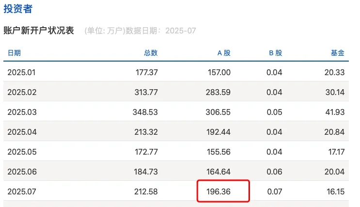 新增开户数同样体现市场热度。上交所发布的报告显示,7月A股新增开户数达196万,相较于6月份环比增长19%,同比大增71%。