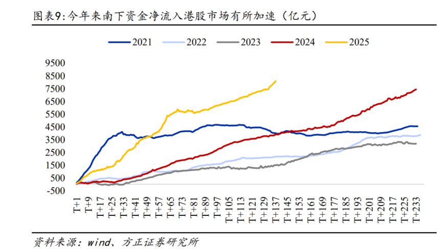 内资大幅南下,外资放缓流出,两者共同作用,导致香港市场流动性非常充沛,只要有利好,即刻大幅上涨,让A股投资者叹为观止。