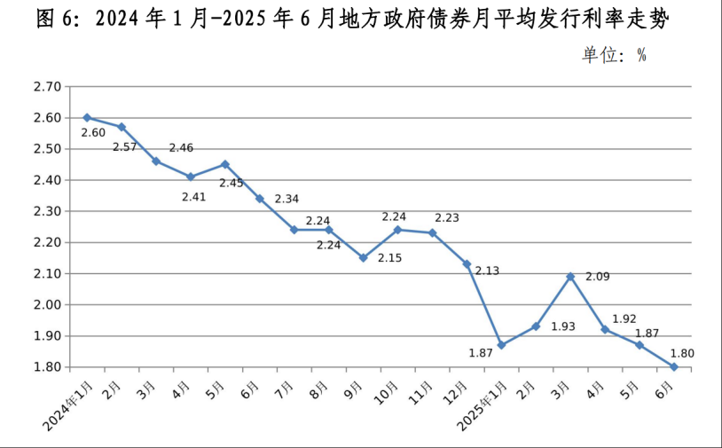 利率降幅更加明显。据财政部数据,从2024年1月到2025年6月,地方债券的月平均发行利率从2.6%大幅降至1.8%。