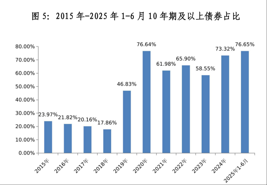 另外,从期限和利率来看,地方债的期限越来越长,10年期以上债券占比创历史新高。据财政部数据,2025年上半年,10年期及以上期限的债券占比达到76.65%,相比于2018年占比大幅提高接近60个百分点。