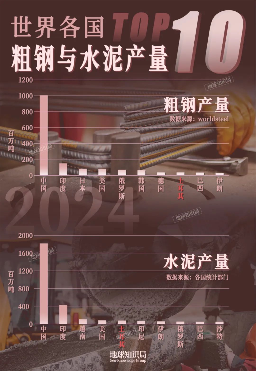 以建筑行业所需的钢铁和水泥为例。在2021 年,土耳其是世界第7、欧洲第2大钢铁生产国。2023年以后,土耳其的产量有所下降,但仍保持在了世界第8。