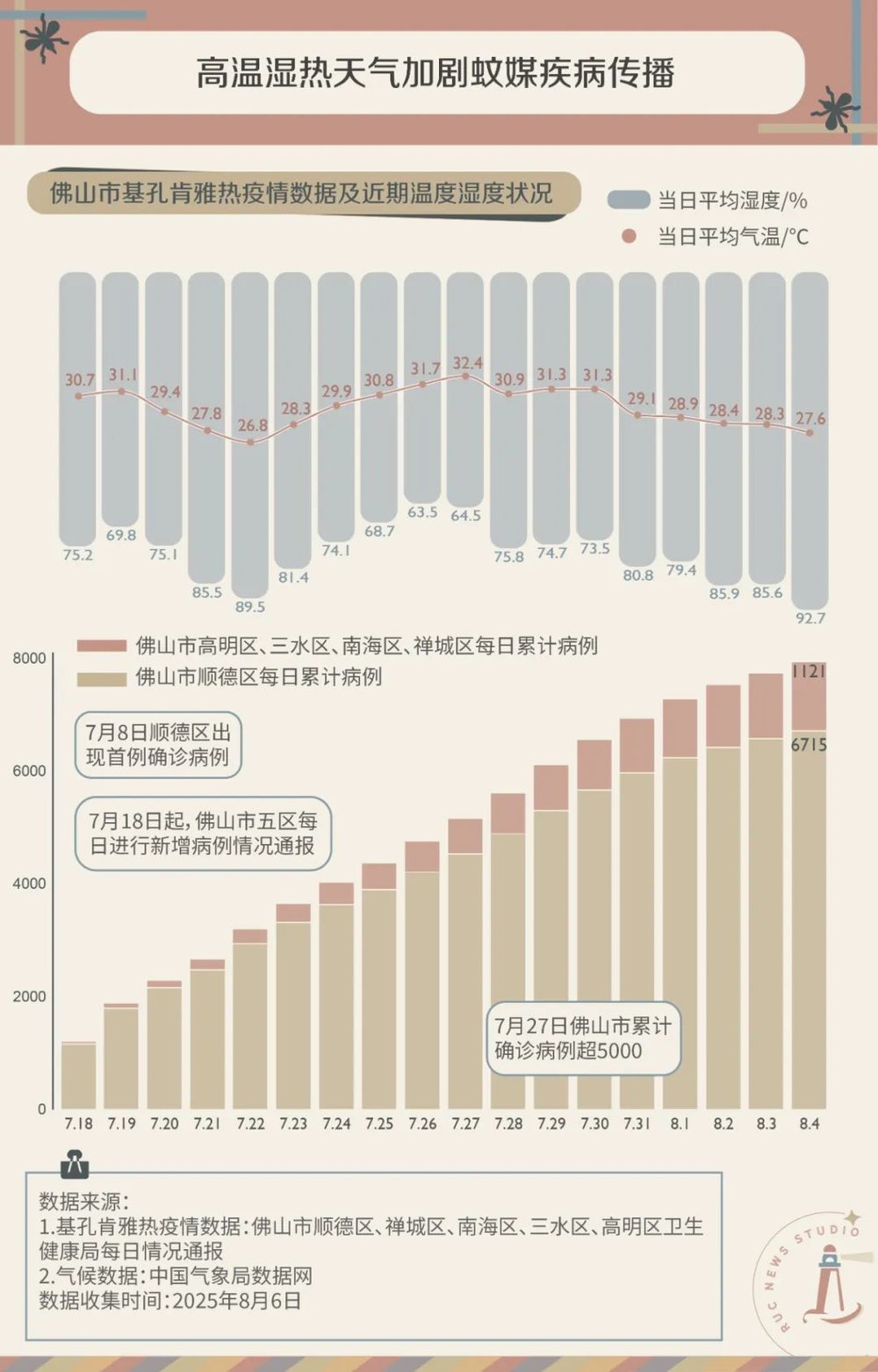 回溯佛山市近期天气情况,7月18日至8月4日的气温多维持在27—32摄氏度之间,湿度则多处于60%—80%的高湿度区间,恰巧与伊蚊的理想活跃及繁殖温湿度环境相符,佛山市的病例亦处于逐日稳定新增的状态。