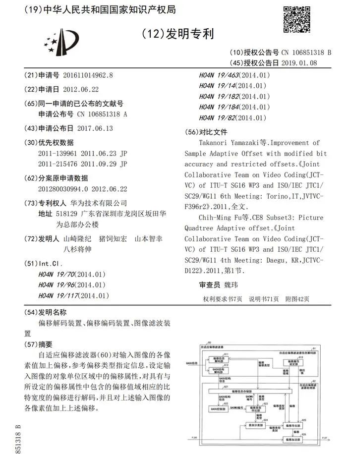 本次诉讼的核心,是华为持有的欧洲专利EP2725797B1。这个专利于2011年首次申请,技术核心是一种应用于视频编解码领域的图像滤波技术,更具体地说,是样本自适应偏移(Sample Adaptive Offset, SAO)技术的一部分。