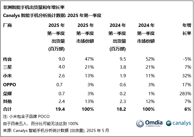 5 月 27 日,Canalys发布了2025年第一季度非洲地区智能手机市场报告,数据显示尽管传音在2025年第一季度的非洲智能手机市场依然占据主导地位,以900万部的出货量和47%的市场份额稳居第一,但其同比下滑5%的业绩,与小米的迅猛增长形成了鲜明对比。