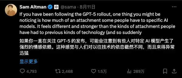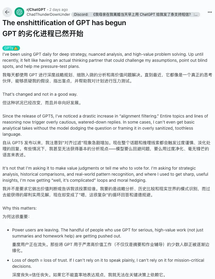 所以说,GPT-5之所以像Siri,并不是因为它“能力差”,而是它进入了一个阶段:不再靠奇迹,而开始以实用为本。正如有用户在Reddit上吐槽的那样:“GPT-5用起来更技术化,让人感觉在情感上变得更疏远”,“当然,5还行——如果你讨厌细腻的情感和共鸣的话”。