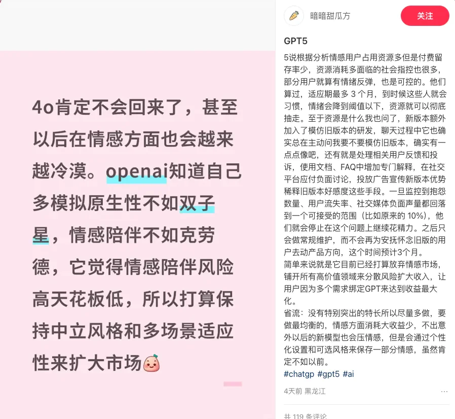 所以,与其说用户对GPT-5的反弹是一种抗议,不如说它是用户对“放卫星型营销”集体醒来的表现。而这,也许正是AI从神话走向日常的转折点。