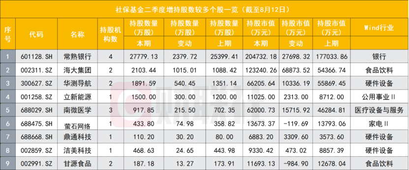 作为首份披露半年报的上市银行股,常熟银行在今年二季度末继续被4家社保基金组合持有,持有家数与一季度末保持了一致,但合计持有股数环比增加2379.72万股,也是截至目前社保基金增持力度最大的一只。