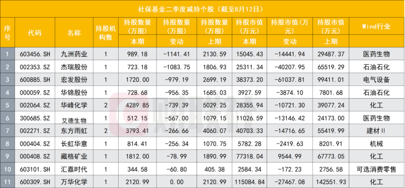 与九州药业相似,杰瑞股份也在二季度被减持超千万股,持有该股的社保基金数量从2只降至1只。