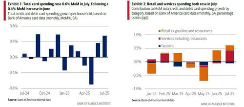 美国银行最新信用卡数据显示,7月消费者支出出现意外反弹,家庭信用卡和借记卡总支出同比增长1.8%,创今年新高。其中,7月经季节性调整的家庭支出环比增长0.6%,较6月的0.2%同比增幅大幅提升。