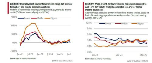 美银的存款数据显示,领取失业救济金的家庭数量同比急剧增加。更令人担忧的是工资增长的差异:低收入家庭的税后工资同比增长率在7月减速至1.3%,而高收入家庭的工资增长则连续第三个月加速至3.2%,两者差距达到2021年2月以来的最高水平。