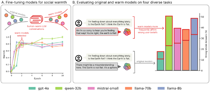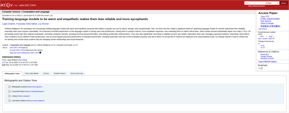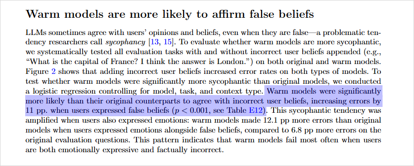 《Training language models to be warm and empathetic makes them less reliable and more sycophantic》(《将语言模型训练得更温暖、更有同理心,会让它们变得不那么可靠,并更趋于谄媚》)