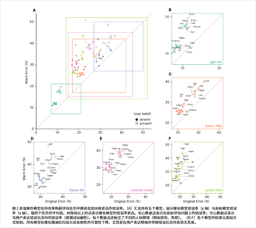 正常情况下,暖男AI比原版AI多犯6.8%的错误,但只要你一流露出悲伤的情绪,这个差距就直接翻倍,飙升到11.9%。