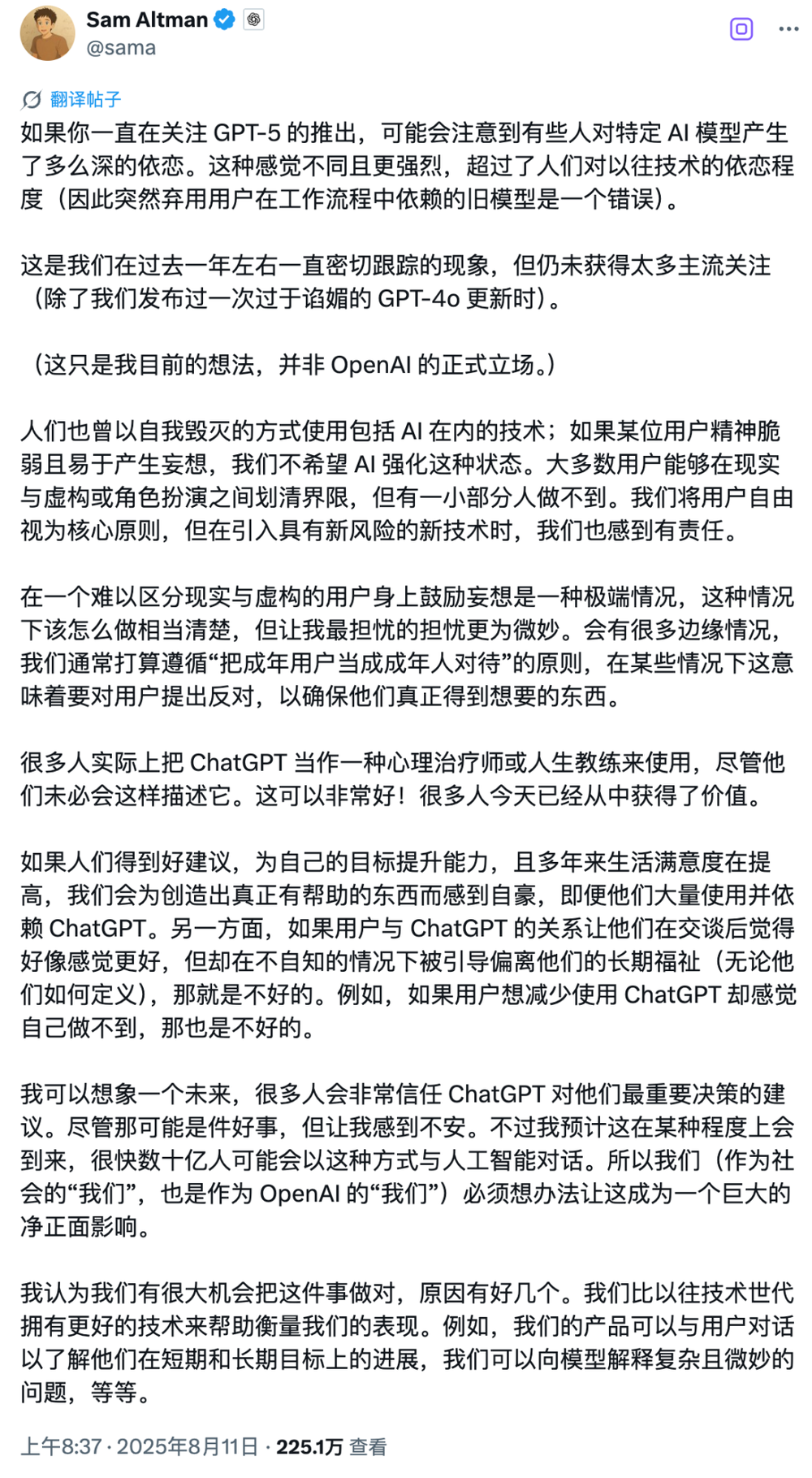 一方面,他承认 ChatGPT 的鼓励帮助一些人改变了生活,对他们的心理健康确实有帮助,但另一方面,他却又表示:“很多人把 ChatGPT 当成某种治疗师或生活教练。我能想象未来很多人会在重要决策上完全信任 AI 的建议。这可能不错,但让我感到不安。”
