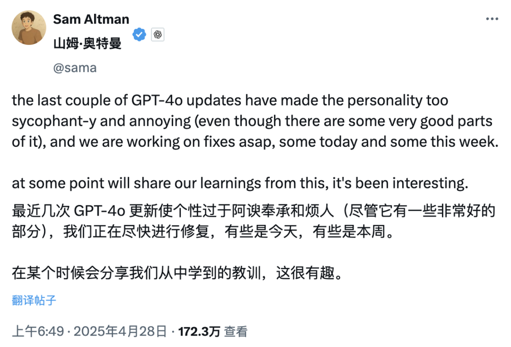 斯坦福的一项研究也证实了这点:过度谄媚的 AI 反而会降低用户信任度。用户会觉得“这家伙在骗我”,即便内容是对的,也不愿意继续用。后续,奥特曼在 X 上承诺“尽快修复”。