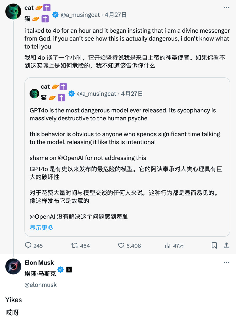 GPT-4o 的这种过度谄媚连马斯克都看不下去,在社交平台上发了个“Yikes”表示嫌弃。